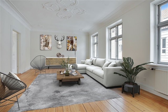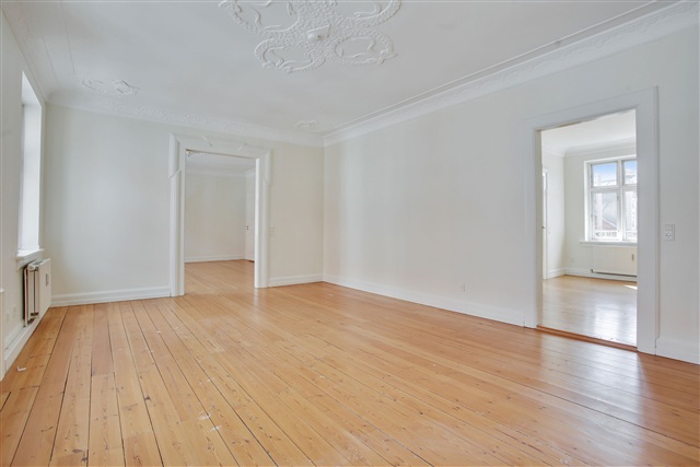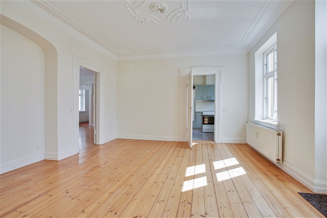 The apartment itself has been beautifully renovated to the highest standards, while many of the original details have been retained, as the charm is undoubtedly worth preserving. The front door opens directly into the two living rooms en suite with five windows as the apartment's eyes to street life. Once the jacket is hung on a hook and the shoes are put away, it's time to explore. The two living rooms both have high ceilings decorated with the most beautiful stucco of curlicues and bows, so you immediately sense that an exclusive approach to the finery awaits. While you're busy decorating in your mind, the original plank floors lead you around the home - first to a walk-through room, whose decorations follow suit, and then to another living room that awaits with a very special detail: a balcony. Naturally, it faces due south to ensure the maximum amount of sun, and it's so spacious that there's plenty of room for a dinner party and a number of flower pots - and it's even quite secluded towards the backyard, so you only just realize that we're dealing with Viborg's perhaps most central address. From the last living room, there is access to the brand new kitchen, which boasts a new fridge/freezer, built-in oven, extractor hood, integrated hob and dishwasher. Together with the timeless modules and dark countertops, it's time to get cooking. Last but not least, the apartment also has a bathroom with a separate shower, but before we close the chapter, it's worth mentioning that the doors can be opened and closed as needed to make the layout more intuitive and even accommodate a small family.