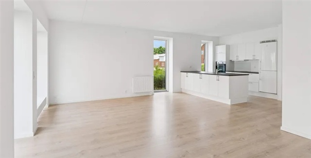 Situated centrally in Snejbjerg, Sydgaden offers convenient walking access to various shopping amenities including Rema1000, the local bakery, and is only 5 kilometers from both Herning and Gødstrup. The apartment comprises an entrance hall, two bedrooms, a bathroom, a storage room, and an open kitchen/living area, along with a private garden featuring a terrace.Each apartment is equipped with a range of features such as a Swane kitchen, built-in oven, induction cooktop, and a refrigerator with freezer compartment. Additionally, they include a washing machine, tumble dryer, dishwasher, and a ventilation system. The bathroom and entrance area are fitted with underfloor heating. Monthly prepayments include water at a cost of 500 DKK. The photos provided serve as guidance, while the floor plan accurately represents the layout.
