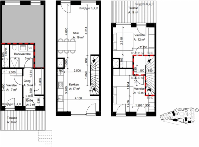 This residence is a contemporary townhouse spread over multiple levels, featuring a well-thought-out design and generous outdoor spaces. The home spans three floors and integrates practical solutions to accommodate both family activities and relaxation. Upon entering, you are welcomed into a vestibule that provides access to the first bedroom along with a spacious bathroom outfitted with modern fixtures. The first floor comprises an open-plan living area combining the kitchen and lounge, where expansive windows allow for abundant natural light. The kitchen itself is both sleek and functional, offering ample workspace and room for communal cooking. On the second floor, there are two sizable bedrooms, one of which opens onto a large south-facing terrace.The property is situated atop Kronen Shoppingcenter, located centrally in Vanløse, where 118 contemporary dwellings enjoy pleasant views, tranquility, and lush courtyard gardens. These homes vary in size, ranging from townhouses suitable for larger families to studios designed for younger residents. The housing units are organized in clusters that encourage a sense of community and promote an engaging environment for both children and adults.