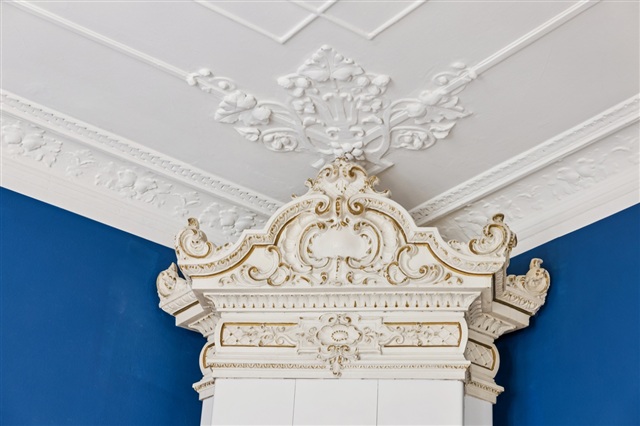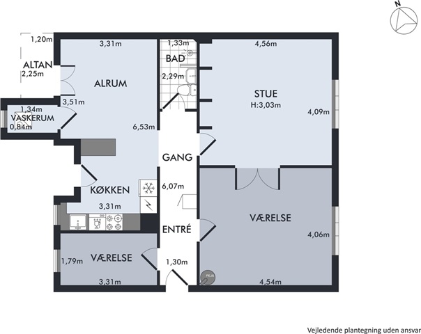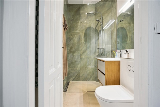 From the well-maintained staircase, you step through the delicately carved front door into 104 elegant square metres divided into a bathroom, a kitchen-living area, a laundry room, a bedroom, and two adjoining living rooms. You enter onto beautiful floors, double doors, and a Swedish porcelain wood stove, while the original stucco adorns the ceiling more than three metres above. Added to this are comfortable modern updates, including a stylish, minimalist bathroom from 2024 with a separate shower, underfloor heating, and recessed lighting. The kitchen-living area brings the family together for meals prepared on the kitchen’s steel countertop, surrounded by light cabinetry and all major appliances. And as the evening winds down, you can step directly from the dining table out onto the west-facing balcony.
