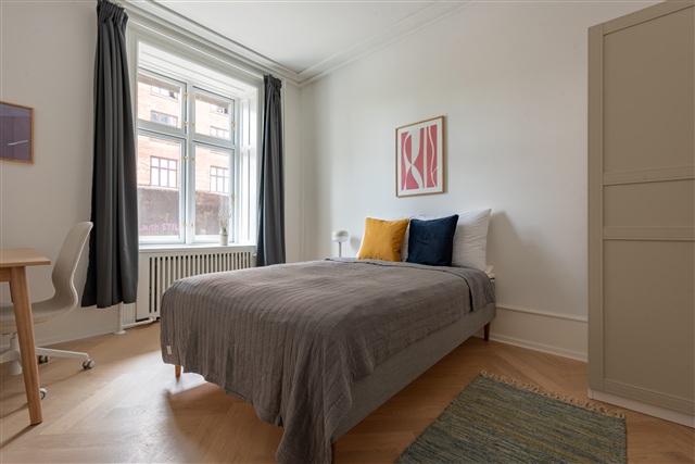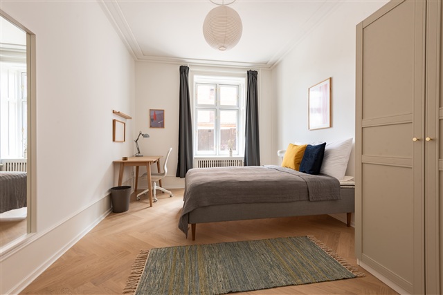 High-quality bed with bedspread, duvet and pillows. Bedside table with reading lamp. Desk with desk chair and desk lamp. Wardrobe with drawers and hanging space. Storage boxes underneath the bed. Curtains, mirror, laundry basket, trash can, rugs and decoration (not all on photos).- Balcony/terrasse
