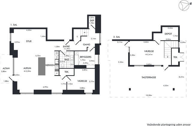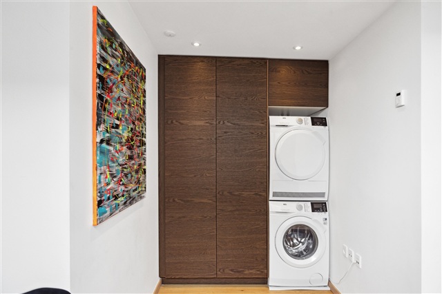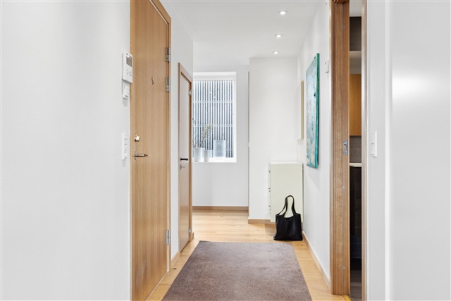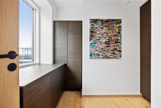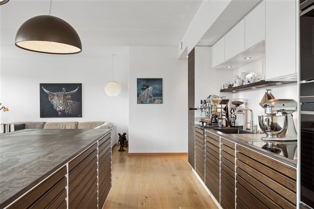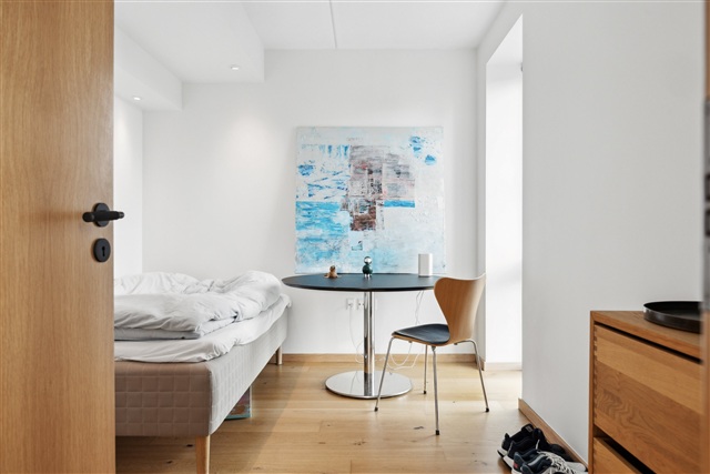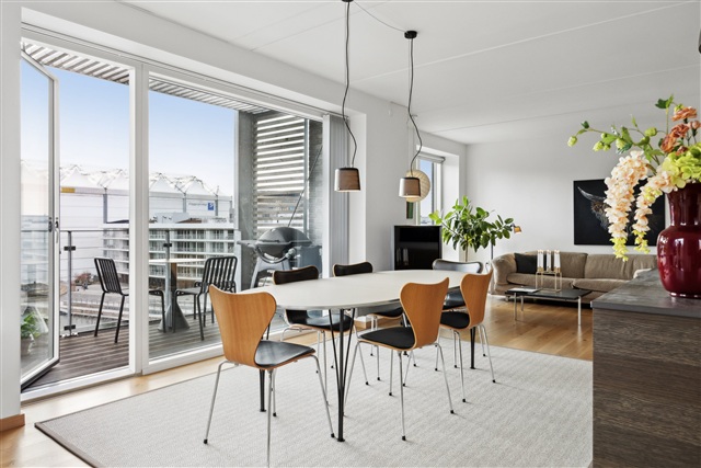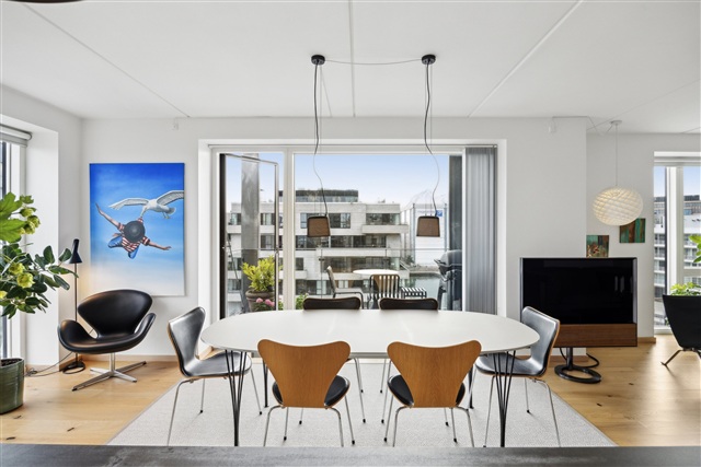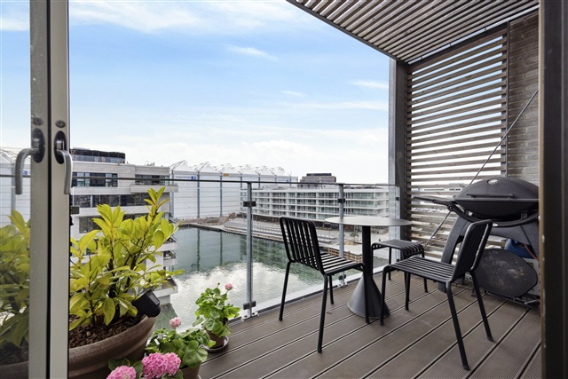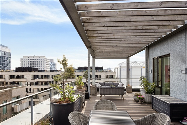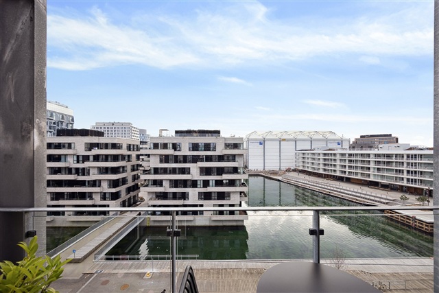 The apartment is located in a beautiful and modern property along the waterfront in Nordhavn. The apartment is located at the top of the building, is in two levels and has access to attractive outdoor areas with a fantastic view of the surrounding area. The apartment is suitable for single tenants, a couple or a small family. You arrive in the apartment's hallway, which appears to be in a good and spacious size. There is room for furniture here and around the corner there is access to a small storage room with space for outerwear. The apartment's living room is in a good and spacious size with the kitchen located in the middle of the room. The living room has large windows facing south and provides a beautiful view of the water. There is a natural division of the dining and living room and the possibility of establishing seating around the kitchen island. The kitchen is fully equipped with all necessary appliances and is of the highest quality.There is a separate bedroom on the lower level of the apartment. There is space here to furnish with a double bed and closets - but can also be furnished as a children's or guest room, if desired. The apartment's bathroom is located on the lower level and is a good size with a separate shower area. There is also a separate utility room in the apartment with built-in cupboards and laundry facilities. An internal staircase leads to the upper level of the apartment. The apartment's main bedroom is currently furnished here, but there are several options for using the upper level. From here is direct access to the apartment's impressive rooftop terrace of 69 m2. The roof terrace is partially covered and can be arranged with several sections. There are two ways to access the roof terrace and an absolutely beautiful view of the surrounding area. The nearest metro station and harbor bus are only a few minutes' walk from the property - just as there are cafes, restaurants and shopping opportunities right in the immediate area. There are good parking facilities in the surrounding parking garages and underground parking areas. Not available as a shared apartment. Utility costs are not included in the rent.