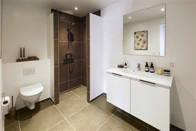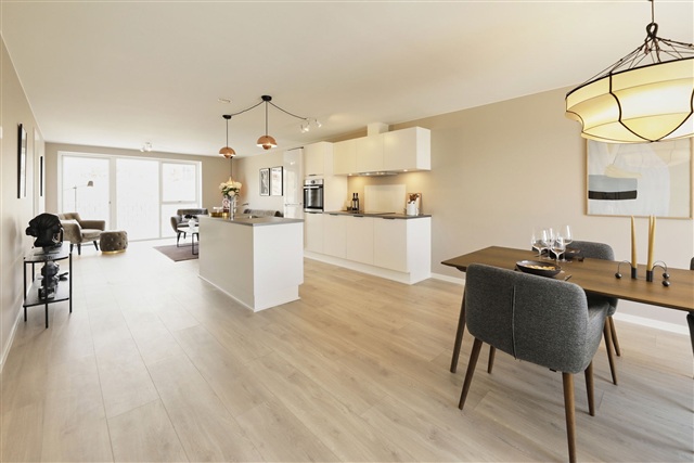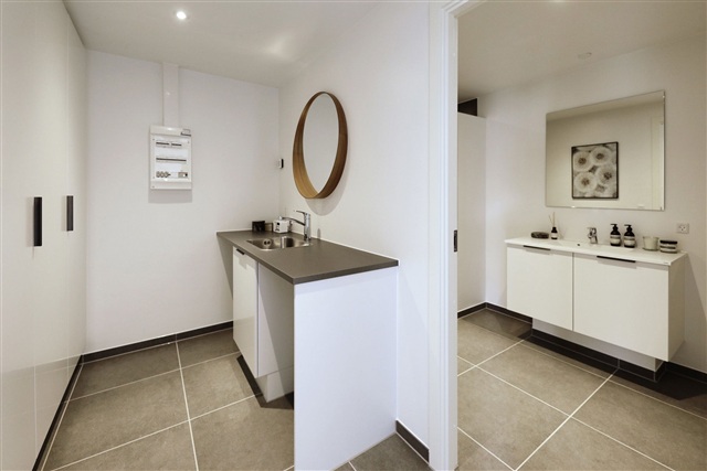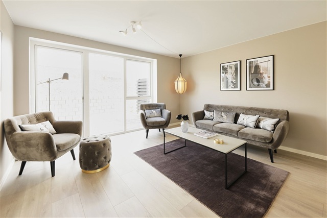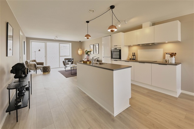 The townhouse features a separate entrance hall with direct access to a large kitchen and living room in one. There are large glass panels at both ends of the room, allowing natural light to flow through. In the middle of the room is the modern and bright kitchen with plenty of space on both sides for a dining table and a cozy living room. From the kitchen area there is access to a large bedroom with closet wall, bedroom, separate utility room and bathroom.Garden: Private garden and terraceOutbuildings: Storage room 7m²Parking: Shared parkingAll consumption is settled directly to the utility companiesOpen and bright townhouseThe houses are bright and friendly with large windows and glass sections with good natural light throughout. White, smooth walls and ceilings are seen throughout.Light floors in the kitchen/living room, living room and bedrooms are made of laminate as oak planks. Entrance hall, utility room, bathroom and shower are finished with large, beautiful tiles in gray with dark flecks.All doors are finished in smooth white with stainless steel handles and without doorsteps for optimal access. Window frames are bricked and water-cut in white. Walls facing the floor are finished with smooth white skirting boards.Terraced house with fine detailsKitchen, bathroom, utility room and bedroom are fitted with modern HTH modules in smooth white finish with stainless steel handles. Practical laminate worktops in rustic slate color with spacious steel sink. Splashback behind cooking section for easy cleaning. Bathroom sink in molded white material. Toilet from Ifö as wall-hung solution, quality fittings from German Hans Grohe and line drain in the shower.All white goods included in recognized quality. Induction hob and oven with pyrolysis technology and fridge/freezer. A washing machine and dryer have been prepared for installation in the utility room, which the tenant must bring themselves.Fixed lighting installation with spotlights in the bathroom and utility room. In addition, spotlights in wall cabinets in the kitchen.There is underfloor heating throughout the townhouse, which is controlled via separate wireless thermostats in all rooms. The home is equipped with a ventilation system that ensures a healthy and good indoor climate.Outside, there is an electrical outlet and faucet as well as a lamp by the entrance and garden door.Consumption for electricity, heating, water and wastewater is settled directly between the tenant and the utility companies. Heating is provided by an air-to-water heat pump with the outdoor module located in the property's utility room. As a tenant, you are entitled to a reduced electricity tax on part of the electricity consumption.Please note that model photos are used on this page. We reserve the right to make corrections.