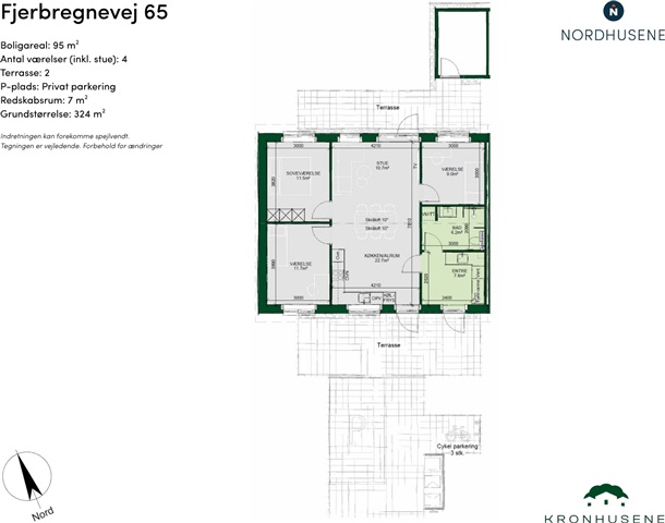 Spacious and modern family home with a focus on light and functionalityWelcome to an inviting 95 m² home that strikes the perfect balance between functionality, comfort, and a bright, friendly atmosphere. Here you get a single-story home with space for family life, tranquility, and cozy moments—all with a well-thought-out design that makes everyday life easier.Well-thought-out floor planThe heart of the home is the large kitchen/family room and living room of almost 33 m². The large windows and sloping ceiling in the room give an airy feeling and beautiful light throughout the day. There is plenty of space for a dining table, sofa corner, and family life – and the room has direct access to the terrace.In addition, you will find:• A bedroom with built-in closets• Two good-sized rooms, ideal for children, an office, or guests• A bright bathroom with a separate shower• A spacious entrance hall with a laundry column and practical storageOutdoor living and practical solutionsThe living room opens onto two terraces, so you can enjoy both the morning and evening sun. The private garden provides space for relaxation and outdoor living, and the property has both private parking, bicycle parking, and a 7 m² tool shed.A modern and functional home where every detail has been considered – from the choice of materials to the floor plan. Here you get a home that is both easy to maintain and wonderful to live in.