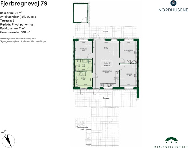 Spacious and modern family home with a focus on light and functionalityWelcome to an inviting 95 m² home that strikes the perfect balance between functionality, comfort, and a bright, friendly atmosphere. Here you get a single-story home with space for family life, tranquility, and cozy moments—all with a well-thought-out design that makes everyday life easier.Well-thought-out floor planThe heart of the home is the large kitchen/family room and living room of almost 33 m². The large windows and sloping ceiling in the room give an airy feeling and beautiful light throughout the day. There is plenty of space for a dining table, sofa corner, and family life – and the room has direct access to the terrace.In addition, you will find:•    A bedroom with built-in closets•    Two good-sized rooms, ideal for children, an office, or guests•    A bright bathroom with a separate shower•    A spacious entrance hall with a laundry column and practical storageOutdoor living and practical solutionsThe living room opens onto two terraces, so you can enjoy both the morning and evening sun. The private garden provides space for relaxation and outdoor living, and the property has both private parking, bicycle parking, and a 7 m² tool shed.A modern and functional home where every detail has been considered – from the choice of materials to the floor plan. Here you get a home that is both easy to maintain and wonderful to live in.