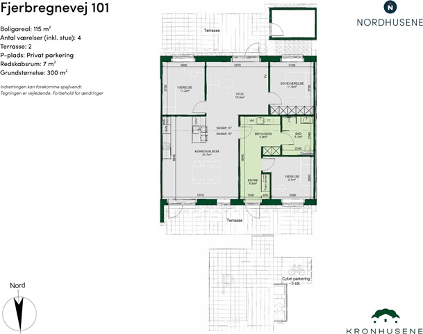 Large and bright family home with well-thought-out detailsWelcome to this spacious 115 m² home, where the emphasis is on light, air and functionality. Here you get a modern, single-story home with room for both socializing and privacy – ideal for families who want a bright and inviting home in peaceful surroundings.Well-thought-out floor planThe heart of the home is the large kitchen/family room and living room of over 30 m². The sloping ceiling and large windows create an open and airy atmosphere, while the exit to both terraces creates a natural connection between indoor and outdoor life. There is plenty of space here for cooking, relaxing, and socializing.In addition, you will find:•    A bedroom with built-in closets•    Two good-sized rooms, perfect as children's rooms, an office, or a guest room•    A bright bathroom with a separate shower•    A practical utility room with its own entrance and washing machine•    A spacious entrance hall with closet spaceOutdoor living and practical solutionsThe living room has direct access to two tiled terraces, so you can enjoy the sun all day long. The property also includes a private parking space, bicycle parking, and a 7 m² tool shed.A modern and functional home with a focus on quality, comfort, and good everyday living—where there is room for both community and tranquility.