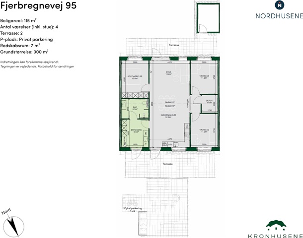 Large, modern family home with space for both socializing and relaxationWelcome to a spacious 115 m² home that combines modern functionality with a bright and inviting look. Here you get a home that is ideal for the active family who wants plenty of space, well-thought-out solutions, and a quiet location close to green surroundings.Well-thought-out floor planThe heart of the house is the large kitchen/family room and living room of over 30 m². The large windows and sloping ceiling give the room beautiful light and an airy atmosphere. There is plenty of space for a dining table, sofa area, and cozy everyday moments. The family room has direct access to terraces on both sides of the house, so you can follow the sun throughout the day.In addition, you will find:•    A bedroom with built-in closets•    Two extra rooms, ideal for children, an office, or guests•    A bright bathroom with a separate shower•    A spacious utility room with its own entrance and washing machine•    An extra storage room, perfect for storageOutdoor living and practical solutionsThe home has two tiled terraces that invite outdoor living and relaxation. The private garden provides space for play, relaxation, and green oases, while private parking and a 7 m² tool shed ensure easy everyday living and extra storage space.A modern and well-designed home where quality and comfort go hand in hand – with space for both community and privacy in green, peaceful surroundings.