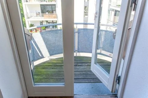 The balcony offers a pleasant view overlooking the shared courtyard, enhancing the tranquil yet central living experience.