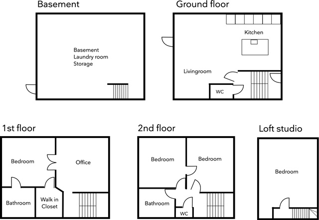 Amazing historical townhouse — 4 floors with lots of light and space - just renovated. Living room, kitchen, 5 bedrooms, 3 toilets, 2 bathrooms, basement, private front- and back yard. In total 244m2 (162m2 BBR + loft studio 28 m2 + basement 54m2). A unique place with beautiful original details, cast iron window frames and pillars, Smeg kitchen, TONI brass faucet. Rented out to a family or the like. From December 15 for up to 3 years. Monthly rate not including water, heating, internet etcIf you want to read the description in its original language that is also possible. Read original description