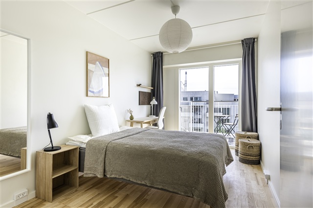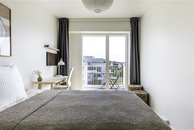 This modern apartment has beautiful wooden floors and large double glass windows and central heating. There are 4 bedrooms, an open kitchen with dining area and a lounge area with TV. There is 1 shared bathroom with a laundry machine and dryer. From the kitchen / livingroom you have access to the 2 large shared balconies and the building has a green backyard with tables and benches. 50 meters from the backyard, at the water front, there is an event room which can be booked for social events exclusively by the tenants in the building complex.High-quality bed with bedspread, duvet and pillows