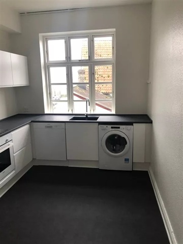 Large 2V right in the heart of Haderslev - on the main street - it doesn't get more central.Bright and friendly apartment of 74 sqm. - perfect for sharing an apartment, as there is a central entrance. Here you get white walls and ceilings, newer, white kitchen with all appliances. Bright bathroom with white sanitary ware, sink recessed into the countertop and nice shower area with white tiles.