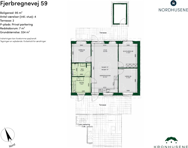 Spacious and modern family home with a focus on light and functionalityWelcome to an inviting 95 m² home that strikes the perfect balance between functionality, comfort, and a bright, friendly atmosphere. Here you get a single-story home with space for family life, tranquility, and cozy moments—all with a well-thought-out design that makes everyday life easier.Well-thought-out floor planThe heart of the home is the large kitchen/family room and living room of almost 33 m². The large windows and sloping ceiling in the room give an airy feeling and beautiful light throughout the day. There is plenty of space for a dining table, sofa corner, and family life – and the room has direct access to the terrace.In addition, you will find:• A bedroom with built-in closets• Two good-sized rooms, ideal for children, an office, or guests• A bright bathroom with a separate shower• A spacious entrance hall with a laundry column and practical storageOutdoor living and practical solutionsThe living room opens onto two terraces, so you can enjoy both the morning and evening sun. The private garden provides space for relaxation and outdoor living, and the property has both private parking, bicycle parking, and a 7 m² tool shed.A modern and functional home where every detail has been considered – from the choice of materials to the floor plan. Here you get a home that is both easy to maintain and wonderful to live in.