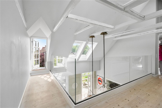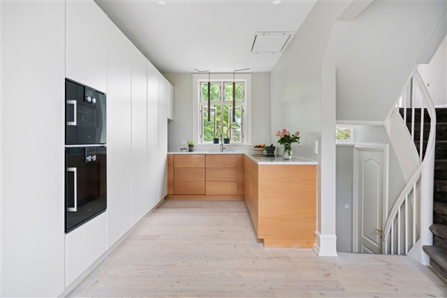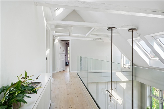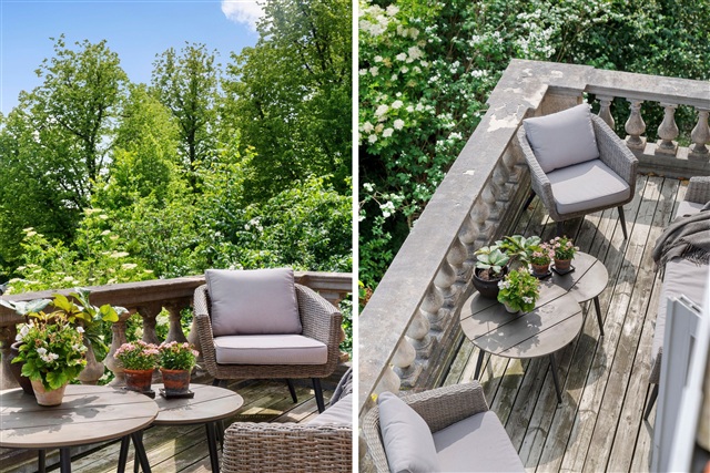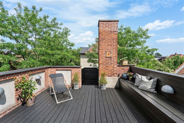 Frederiksberg is known for honoring talented individuals by naming its streets after them, a tradition that commands respect. Among these unique designations is Femte Juni Plads, which pays tribute to the Danish constitution with its distinctive date-based street name, an uncommon feature in Denmark. This location is as striking as the constitution it commemorates.The apartment at Femte Juni Plads is spread over the first and second floors, encompassing 219 square meters. It features a partially vaulted ceiling on the first floor, a private rooftop terrace, a balcony, a basement, and access to a garden, offering generous living space. The building dates back to 1928, constructed during the master builder period influenced significantly by the Bedre Byggeskik movement. Such buildings were typically designed as middle-class homes situated in residential rings outside major cities, beyond the initial affluent villa districts characterized by patrician houses and townhouses.