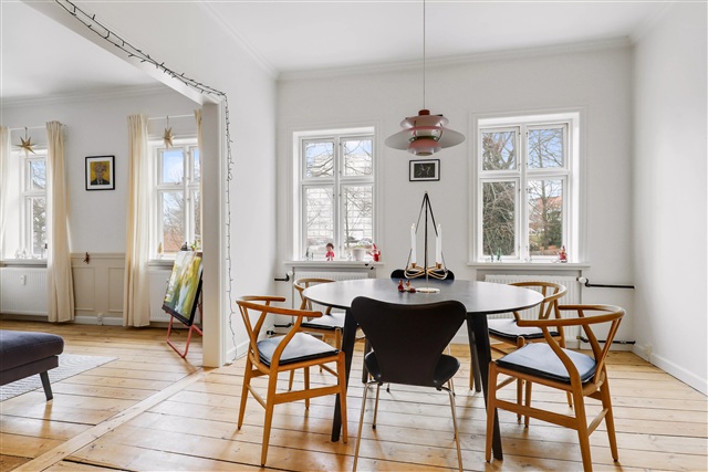 Positioned directly opposite Esbjerg Bypark and the Musikhuset, within a beautifully renovated building on Englandsgade, this exceptionally spacious apartment offers one of the largest living areas in Esbjerg, measuring 209 square meters. The residence comprises a total of seven rooms along with two bathrooms, making it highly suitable for a family or a business requiring accommodation for multiple staff members.This ground floor apartment stands out due to its exquisite choice of materials and prime location, providing a distinctive living environment.