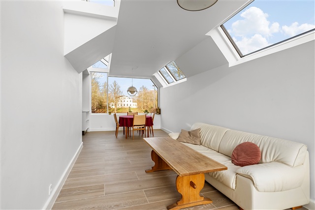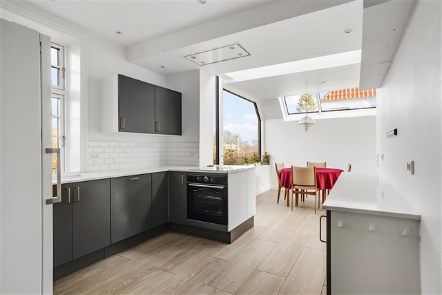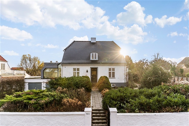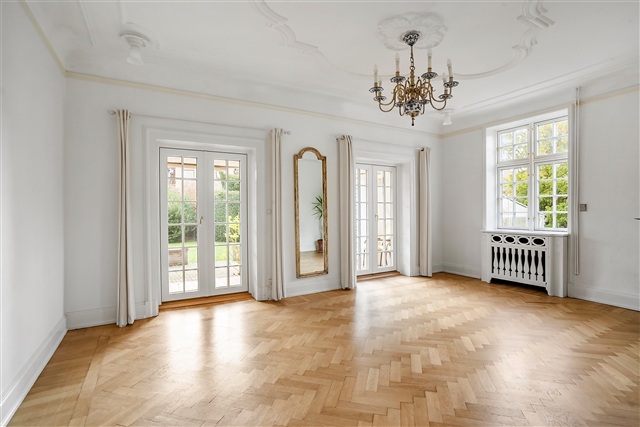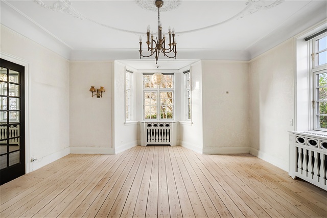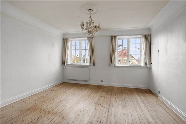 This beautiful mansion, dating back to 1928, boasts a one-of-a-kind location directly adjacent to Emdrup Lake. Now available for rent, this unique villa stands in the frontline to the lake, offering quick access by car to both central Copenhagen and the international schools situated in Hellerup and Nordhavn. The property is leased for a maximum term of three years and is exceptionally well maintained, featuring a brand-new roof and recently installed windows.The impressive plot spans over 1,000 square meters and includes a mature, attractive garden alongside two garages. Upon entering the villa, one is greeted by an elegant hallway that leads to the staircase ascending to the first floor. On the ground level, the layout includes an entrance area connected to a bathroom equipped with a bathtub, a spacious room, a living room, and a formal dining room that opens onto a veranda and a charming terrace. Additionally, there is a grand kitchen/dining space in an extension, fitted with skylights and large windows. From the dining section of this kitchen area, there is a striking view directly over the lake, with the historic Søholm estate as a central focal point.