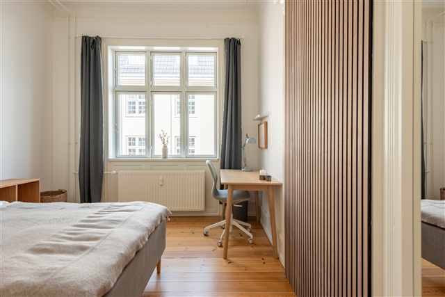 This beautiful apartment was fully renovated during 2021. The apartment has 4 single bedrooms, a modern spacious bathroom and a fully equipped kitchen with large dining table, a large separate living room with sofa, lounge chairs, TV, etc. and a private balcony facing the green backyard.High-quality bed with bedspread, duvet and pillows. Bedside table with reading lamp. Desk with desk chair and desk lamp. Wardrobe with drawers and hanging space. Storage boxes underneath the bed. Curtains, mirror, laundry basket, trash can, rugs and decoration (not all on photos)