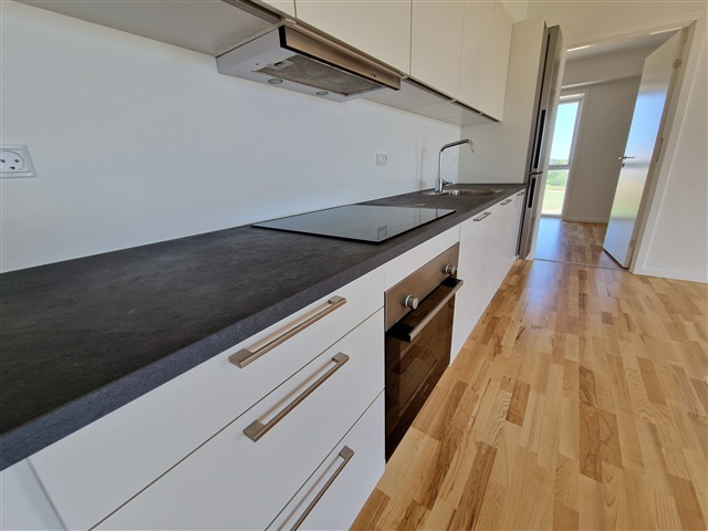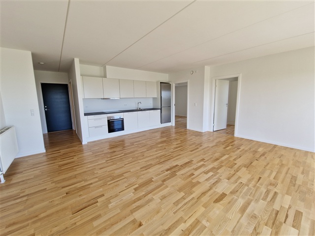 Situated on Marshalls Allé, this bright and spacious three-room apartment offers access to a large balcony. The unit includes a built-in storage room measuring 1.6 m² and provides residents with shared car and bicycle parking facilities. The communal area features amenities such as a children's play structure and several tables with benches arranged thoughtfully throughout the surroundings. The landlord maintains a high level of service for tenants.Additional details include flooring made of ash lamella parquet, kitchen furnishings from Invita, and Bosch appliances which consist of a ceramic glass cooktop, oven, dishwasher, and a combined refrigerator and freezer. The apartment is also equipped for a washing column, has underfloor heating in the bathroom, and all units in the building come with either a balcony or terrace. Convenience is further enhanced by an elevator and a door entry system, while communal parking and bike storage are available on site.