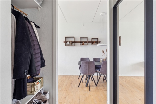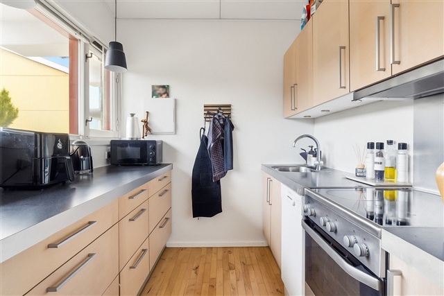 Large hallway with plenty of storage space, from which there is further access to a large bedroom, where there is plenty of space for a double bed and a large closet. From the entrance hall there is also access to a newer bathroom and a large living room with lots of possibilities for interior design. From the living room there is access to a newer kitchen with all white goods. By the kitchen there is also a small enclosed room that can be used as an office.