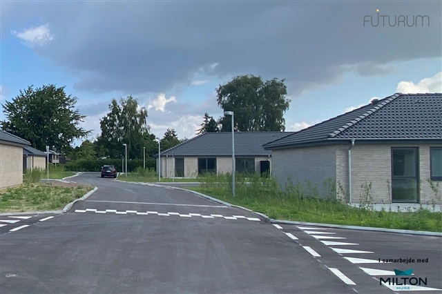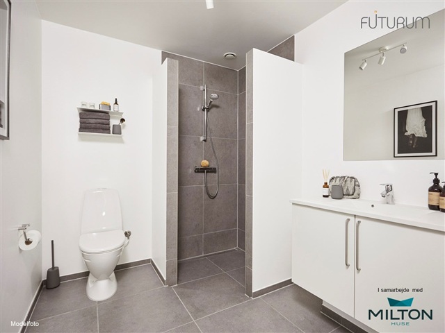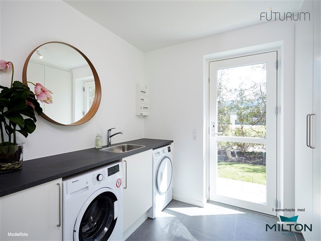 The bathroom features large anthracite tiles on the floor, a molded sink, an Ifö toilet, and all fittings are German-made by Hans Grohe. The shower niche is equipped with a designer drain, and the fixed bathroom units-comprising a washbasin and mirror-are from HTH. Climate control is managed wirelessly, with underfloor heating installed throughout all rooms. A sound-insulated heat recovery ventilation system is also in place. Lighting includes recessed spotlights in the bathroom, utility room, and entrance. Outside, there is a water tap and a mailbox located by the home.