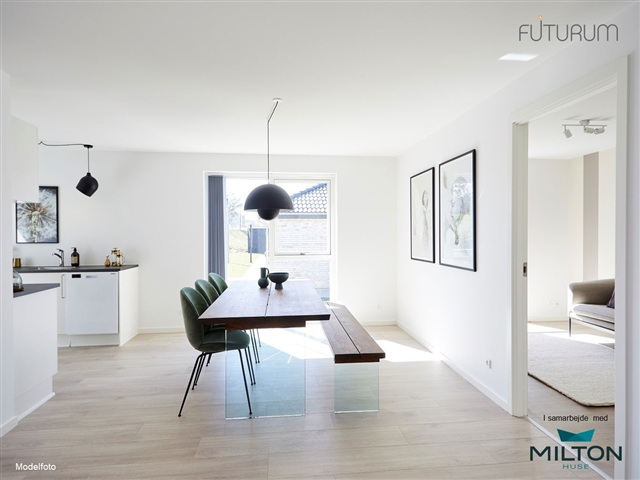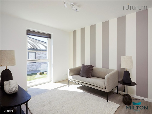 The bedrooms include generously sized children's rooms and a master bedroom equipped with built-in wardrobes from HTH, and all rooms feature oak plank laminate flooring. Throughout the residence, walls and ceilings are finished in a smooth white paint, complemented by white lacquered woodwork and smooth white doors with stainless steel handles. There are no door thresholds, making movement effortless. The window sills are constructed from white brick and plaster.