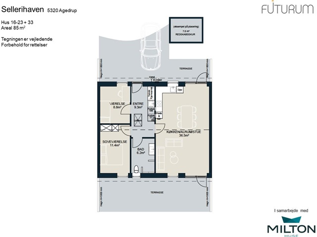 This well-planned terraced house makes optimal use of every square meter. It comprises an entrance utility room that leads into the bathroom, followed by a spacious open-plan kitchen and living area combined, a bedroom featuring three built-in wardrobes, and an additional room. From the kitchen and living space, there is direct access to the property's garden and two separate terraces situated on opposite sides of the house. The plot also includes a private 7-square-meter storage shed and a driveway.The garden and terrace areas belong exclusively to the property, and parking is available with two designated spaces adjacent to the home. All utility expenses are paid directly by the tenant to the respective providers. These terraced houses are distinguished by thoughtful details throughout. The kitchen is designed openly with fixed cabinetry from HTH and includes high-quality appliances. Behind the cooking area, a glass splashback facilitates easy cleaning, while the countertops are covered in a rustic slate-colored laminate, complemented by a spacious stainless steel sink. The open-plan kitchen and dining area seamlessly connect to the living room, which has a terrace door leading out to the garden and terrace.