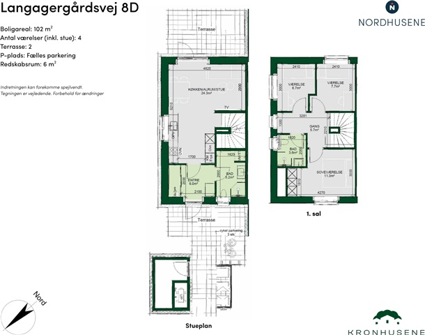 Outdoor living is enhanced by two tiled terraces facing east and west, allowing for enjoyment of sunlight throughout the day. Practical amenities include access to a shared parking lot, bicycle parking, and a 6-square-meter garden shed. This modern residence offers an inviting and functional two-level home where space, natural light, and convenience come together, ideal for those looking for an easy lifestyle set within green surroundings.