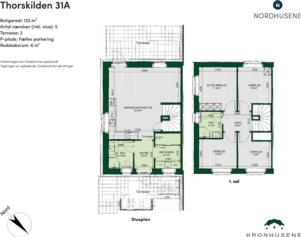This spacious two-story townhouse, encompassing 122 square meters, is designed to accommodate the needs of a family with a focus on practicality, comfort, and everyday life. The interior offers a bright and welcoming atmosphere, thoughtfully arranged to provide areas for socializing, play, and quiet activities, all presented within a timeless design featuring smart, functional elements.Entering the ground floor, you are greeted by a hallway that leads to a well-lit bathroom and a practical utility room equipped with a washing machine and storage space. The heart of the home lies in the nearly 30 square meter open-plan kitchen and living area, which is flooded with natural light from large windows. This generous space easily accommodates both a dining area and a lounge setup, and from here, direct access to the outdoor terraces extends the living area into the fresh air.