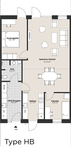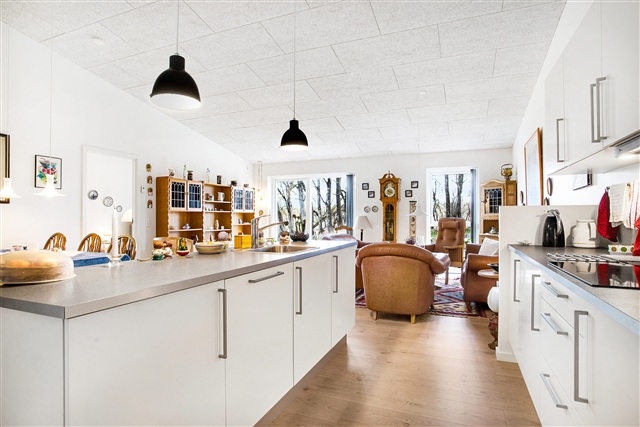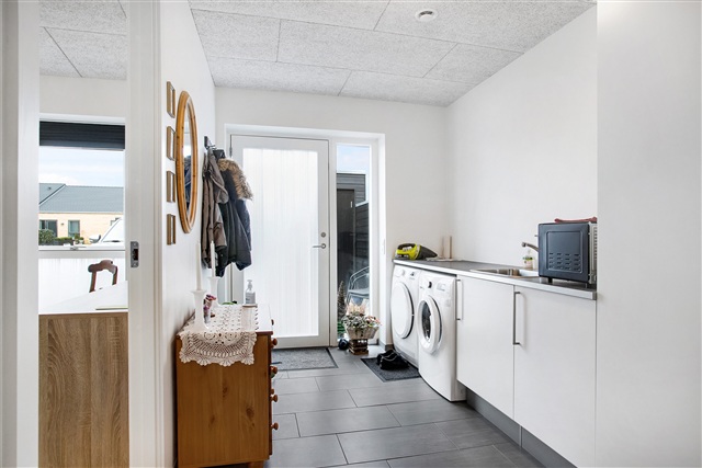 The practical utility room doubles as an entrance area. It is fitted with a washing machine, dryer, and a sink. From the entrance, there is direct access to the bathroom as well as to the heart of the home-the spacious kitchen-dining room.