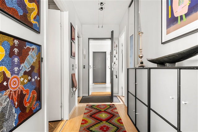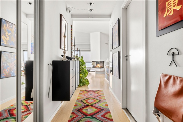 Upon entering, a generous hallway welcomes you, serving as a natural hub for the home's layout. From here, you gain access to a bedroom, a convenient utility room, a well-maintained bathroom, and the remainder of the apartment. The design balances thoughtful practicality with an emphasis on light, airiness, and the expansive views.
