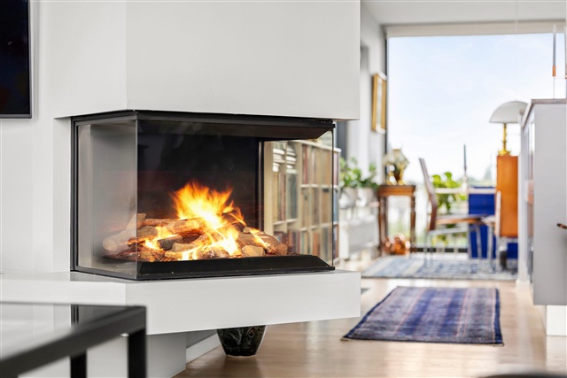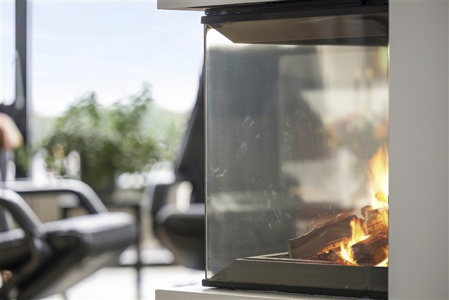 Moving into the large kitchen-living area, the apartment truly opens up. Immediately captivating are the sweeping water views streaming through the expansive window panels. This space functions as the heart of the apartment and includes a cozy fireplace, ample room for comfortable seating arrangements, and a sizable dining area capable of accommodating a long table-ideal for everyday living as well as hosting family and friends on special occasions.