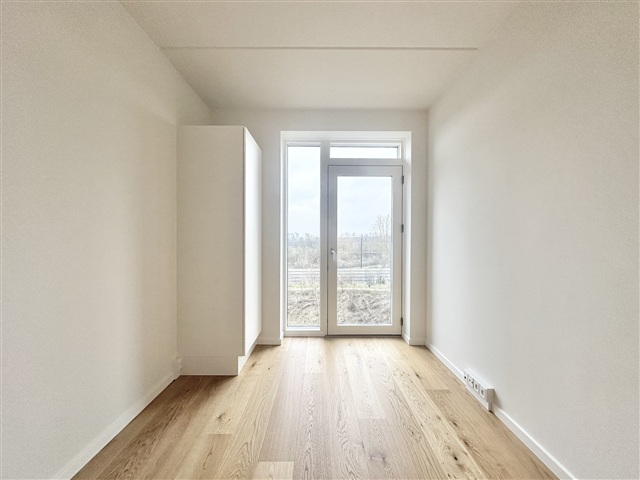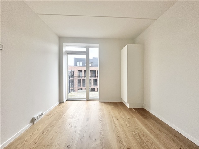 A newly constructed three-room apartment spanning 86 square meters is now available for rent, featuring access to a lovely terrace. Upon entering, one steps directly into the largest area of the apartment, which combines the living room and kitchen. Near the main door, there is a modest partition designed for storing outerwear, shoes, and similar items. This divider is tastefully done to ensure that natural light still permeates the spacious room.The kitchen and living area form a continuous, well-lit space. One side can accommodate a dining area, while the opposite end serves well as a TV lounge. Centrally positioned within this room is a kitchen outfitted with a mobile island on wheels, allowing flexible placement as desired. The kitchen boasts a matte white finish from Designa and is topped with a bright Corian countertop. It is fully equipped with stainless steel appliances from Miele, including a wine cooler.