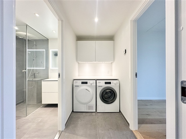 From the living room, there is direct access to the delightful terrace. The bathroom is elegantly tiled and includes a shower niche, fixtures, and sanitaryware from Grohe, as well as bathroom furnishings by Duravit and underfloor heating. Additionally, the apartment offers a convenient utility room fitted with its own washing machine and dryer.