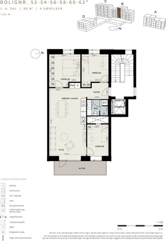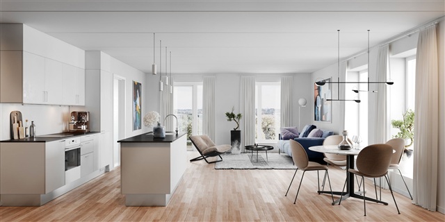 The residences feature a simple Nordic design characterized by expansive windows that ensure abundant natural light and scenic views throughout the well-planned apartments. The floors are fitted with three-strip, matte lacquered oak parquet in a natural finish, providing an ideal foundation for any style of interior decoration. In the kitchens, cooking is done using HTH's white KP Mono series, complemented by an aluminum baseboard and a gray stone-look laminate countertop, along with the sleek Grohe Cosmopolitan faucet installed in the sink. Practical spotlights are integrated into the overhead cabinets, and all kitchen appliances are included as standard. Thanks to the generous daylight streaming through the large windows, the kitchen and living area combine into the home's appealing and central living space. Please note that the photos do not depict the exact apartment, and the floor plans are indicative; minor changes may occur.