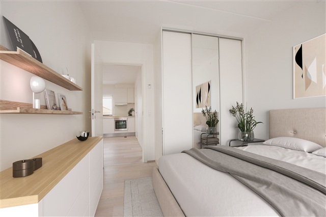 Situated in the scenic area of Lystrup, just north of Aarhus, Ellebrinken offers this rarely available two-room apartment. The location is peaceful, with close proximity to the Light Rail (Letbanen) and within cycling distance of the city center.The apartment makes full and efficient use of every square meter and features an entrance hall equipped with ample closet space for coats and shoes. The kitchen and living area benefit from large windows that fill the space with natural light. A spacious bathroom is fitted with light-colored tiles, plenty of storage, a wall-mounted toilet, and a combined washing machine and dryer. The sizeable bedroom includes built-in wardrobes, and both the kitchen-living area and bedroom open out to a pleasant balcony.