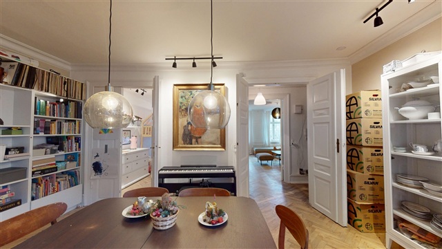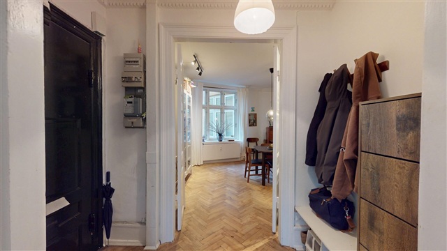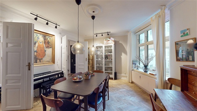 Situated on one of Copenhagen's most coveted streets, just steps from Nørreport, this stunning and exceptionally well-laid-out apartment blends timeless charm with spacious and practical design. The residence offers a floor plan ideally suited for couples, families, or anyone seeking generous living space in the heart of the city.Upon entering, you are greeted by a large and welcoming hallway featuring high ceilings and ample room for coats, shoes, and storage. This entrance area serves as a natural hub within the home, providing access to several of the apartment's main living spaces. Leading on from the hallway, the expansive living room stands out with its abundant natural light and generous proportions, allowing for both lounging and entertaining zones. Adjacent to this is the separate dining room, offering an ideal setting for family dinners or gatherings with friends. Together, these two rooms create a refined and classic ambiance, affording plenty of room for everyday living as well as special occasions.