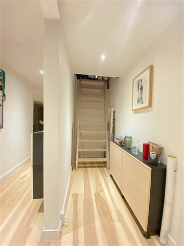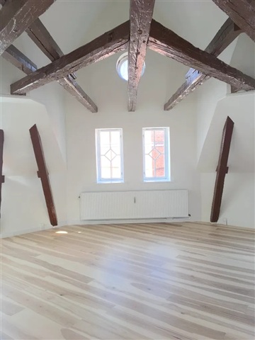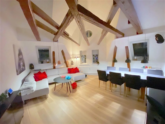 This top-floor apartment offers a blend of natural light and distinctive character, creating a welcoming and ready-to-move-in living space. Spanning 130 square meters, this spacious five-room residence features a charming attic setting, highlighted by exposed beams and elegant small-pane windows that flood the rooms with daylight.The expansive living area benefits from impressive ceiling heights, fostering an open and inviting environment ideal for both relaxation and social gatherings. The kitchen combines modern design and practicality, outfitted with white, handle-free cabinetry along with a gas cooktop, built-in oven, and dishwasher, ensuring a smooth cooking experience.