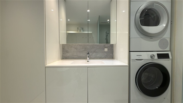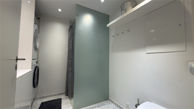 Facilities: Includes a spacious bedroom, a modern bathroom with a walk-in shower and laundry tower (washer/dryer), and a fully equipped kitchen with a dishwasher.