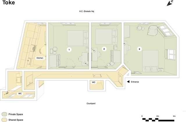 This fully renovated apartment features a lengthy hallway that serves as the main access point to all bedrooms, the kitchen, and the bathroom. The flooring throughout consists of solid wood, a traditional choice commonly seen in Copenhagen residences. The kitchen is well-equipped with essential appliances and includes a dining area with a table.The bathroom stands out with its separate shower alcove as well as an integrated washer and dryer unit. Each of the bedrooms is spacious, with the third room being notably large at 24 square meters.