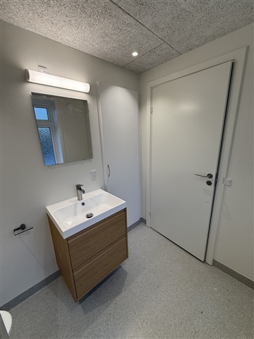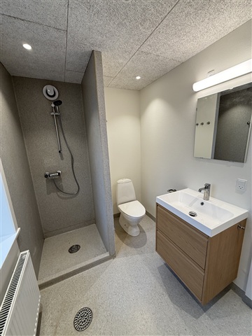 The bathroom is spacious and stylish with trolltekt ceilings, spotlights, wall-mounted cabinet furniture, separate shower and floor drain in both the shower and living area for extra comfort.