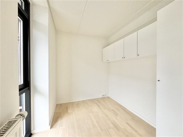 Located on the second floor in Munkebjerg Park, this appealing two-room apartment spans 49 square meters. Upon entering, you are welcomed into a spacious hallway equipped with built-in wardrobes that lead directly into a sleek open kitchen featuring high-gloss cabinetry, a granite countertop, and a full range of appliances including a dishwasher.From the hallway, you access a compact bedroom with fixed storage units. The large, well-appointed bathroom offers a shower enclosure, a wall-mounted toilet, cabinet space, a combined washer-dryer unit, and heated floors for added comfort.