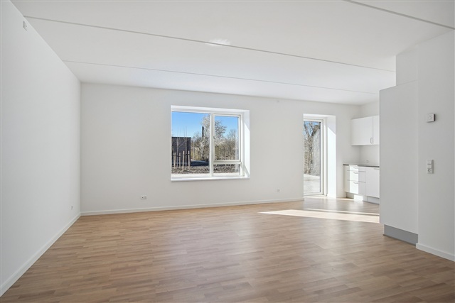 This spacious and contemporary apartment features a large, bright kitchen-living area. It includes one bedroom equipped with built-in wardrobes and an entrance hall providing additional storage space. The kitchen comes fitted with a combined fridge-freezer, ceramic stovetop, extractor fan, built-in oven, and a dishwasher. The bathroom is well-lit and contains a shower enclosure along with a laundry column.The residential complex is surrounded by extensive green communal spaces with pleasant paths and landscaping. Residents share access to communal greenhouses, raised garden beds, and a fire pit area, all of which are tended collectively. Parking is available to rent nearby at a neighboring property, where 39 parking spots are being established. Filmbyen is located just 12 kilometers from Copenhagen, offering easy access to the city's wide range of shopping options, vibrant restaurant and café scenes, and diverse cultural activities. Public transport stops are situated only 500 meters from the apartments, and multiple daycare centers and kindergartens are found within a few kilometers' radius.