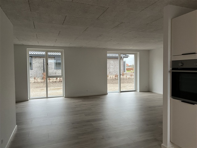 The homes are designed to be open and bright. They feature sound-absorbing concrete ceilings, smooth white walls, and large, operable windows to maximize natural light throughout. The living spaces-including kitchen, dining, and living rooms-are fitted with floor-to-ceiling windows to enhance daylight. Flooring in both living areas and bedrooms consists of light oak laminate planks. The entrance/utility room, bathroom, and shower areas have elegant and practical gray tiled floors. All doors carry a smooth white finish with stainless steel handles and are installed without thresholds for seamless access. The walls conclude at the floor with smooth white baseboards.