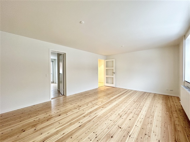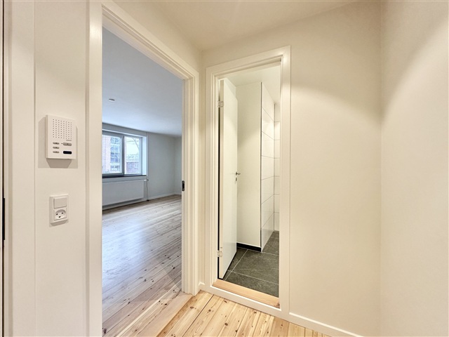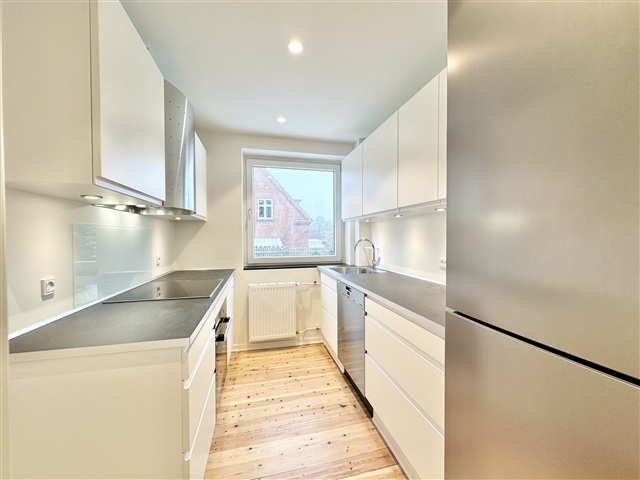 Adjacent to Odense Stadium, a beautifully renovated two-room apartment measuring 67 m² is available for rent. The unit is situated on the elevated ground floor of a building that contains only six apartments.The residence features a modern kitchen from Designa, equipped with a full range of Miele appliances, including a dishwasher. The bathroom is elegantly tiled and fitted with a shower, and the fixtures are from Duravit and Grohe. A spacious and bright living room complements a well-sized bedroom.