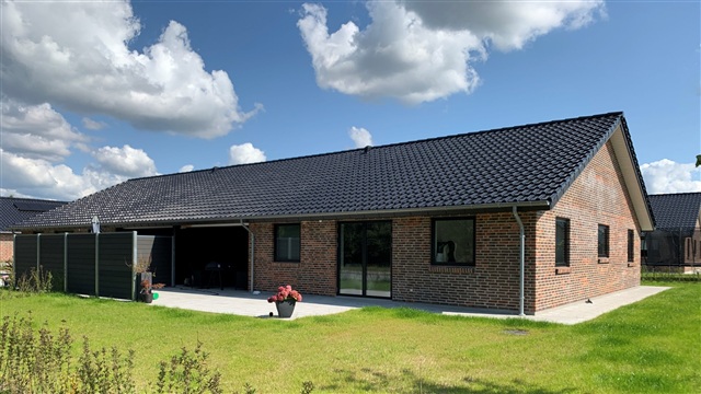 The residence features a spacious entrance area designed to accommodate the installation of a personal washing machine and dryer, alongside a large open-plan kitchen and living room, three well-sized bedrooms, and a bathroom. It includes a private garden with a covered terrace and a protective fence. Additionally, there is an integrated carport connected to the house, extending to an insulated outbuilding.Equipped with solar panels, the property benefits from reduced energy consumption. All rooms contain wireless-controlled underfloor heating. The home is one half of a duplex, sharing a neighbor on only one side.
