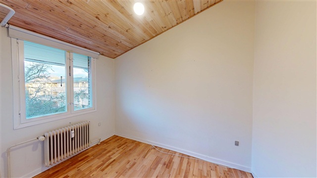 The hallway also grants access to the bedrooms. The main bedroom is bright and sizable, with sufficient space for a double bed and wardrobes. In addition, there is a smaller room suitable for use as a children's bedroom, home office, or guest room, depending on your needs. The bathroom is practical and well-maintained, offering good space and a functional layout.