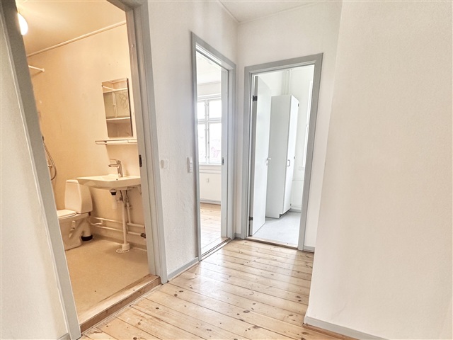 Located in the heart of Fredericia, this well-maintained two-room apartment offers 46 m² of living space on the ground floor. The unit features a compact, brand-new kitchen equipped with modern appliances.The accommodation includes a spacious bathroom with a shower, a bright living room, and a comfortably sized bedroom. The floors are sanded and lacquered, enhancing the overall aesthetic. Additional amenities include an intercom system, access to a shared laundry facility, a basement storage room, and entry to a large communal garden.