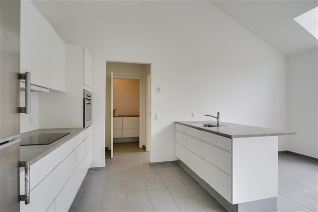 From the kitchen and dining area, doors lead directly to the terrace, a utility room, a bedroom, and a hallway. The living room also features a vaulted ceiling and is illuminated by abundant natural light streaming through the bay window. Additionally, the living room opens onto the lovely south-facing terrace. From the living room, a small corridor connects to a minimalist, light-filled bathroom equipped with white fixtures and a shower niche, as well as to a bright bedroom.