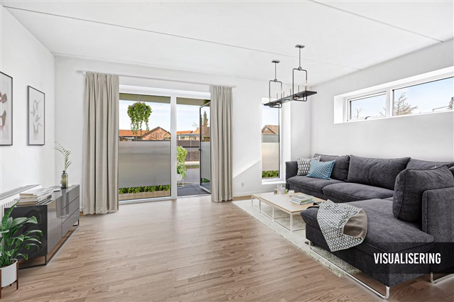 The Nordlandet Risskov development consists of 74 privately rented residences that vary in size and type, ranging from 50 to 128 square meters. The property includes apartments with two, three, four, and five rooms designed for families or shared living, as well as two-story townhouses. Centrally located within the complex, and close to the residences, there is a green communal garden area intended for relaxation and outdoor activities for residents. Every unit benefits from either a private enclosed terrace or a balcony.