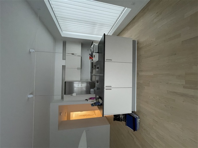 This contemporary three-room apartment features high-quality materials throughout and a thoughtfully designed layout. The residence includes an inviting kitchen and dining area with a kitchen island and ample space to accommodate a large dining table. The kitchen is well-equipped with abundant cabinet storage and comes complete with modern appliances such as a refrigerator/freezer, cooktop, chimney hood, built-in oven, and dishwasher. From the kitchen and dining space, there is direct access to a spacious, private terrace.The apartment offers two well-sized bedrooms, one of which is fitted with built-in wardrobes. The bathroom is notably large and functional, equipped with a shower enclosure and a washer-dryer stack. Additionally, the unit has an entrance hall providing built-in closet space, along with an alcove designed to store both shoes and outerwear. Please note that the photos shown are from other units within the building.