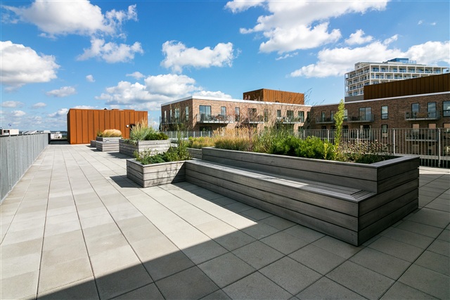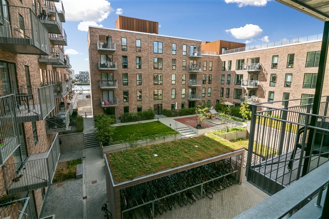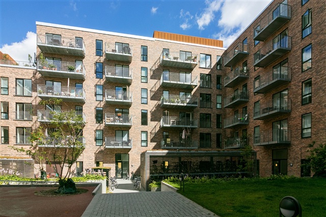 The building's architecture draws inspiration from traditional Copenhagen courtyards, marrying classic design elements with a focus on comfort and functionality. Residents benefit from shared communal spaces including a rooftop terrace and courtyard area that features a playground and bicycle parking.